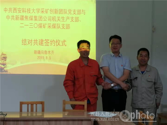 8月5日,能源学院采矿创新团队党支部与新疆焦煤(集团)有限责任公司机关生产支部、二一三〇煤矿采煤队支部开展结对共建活动。焦煤集团总工程师陈建杰及相关人员、能源学院副院长解盘石及支部一行5人出席仪式。