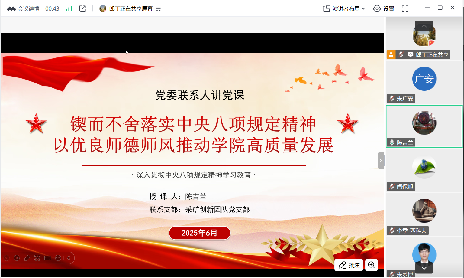 根据学院党委统一部署安排,2025年6月9日,能源与矿业工程学院党委书记陈吉兰同志为采矿创新团队党支部讲授题为“锲而不舍落实中央八项规定精神,以优良师德师风推动学院高质量发展”的专题党课。