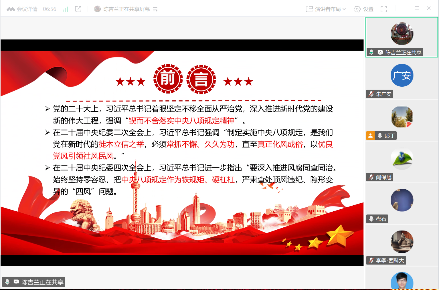 陈吉兰同志分别从“中央八项规定从制定到实施的重要节点、中央八项规定和中央八项规定精神的联系与区别、落实中央八项规定的宝贵经验、新时代新征程持续落实中央八项规定精神的措施、科研经费使用中的纪与法、结合工作实际锲而不舍落实中央八项规定精神”六个方面为大家系统梳理了落实中央八项规定精神的实质、内涵、重点任务,结合教师党员的工作实际重点对教育教学活动、科研经费使用管理等方面的工作提出了明确的纪律要求,通过丰富的警示案例为大家解读了日常工作生活中不能触碰的底线红线。