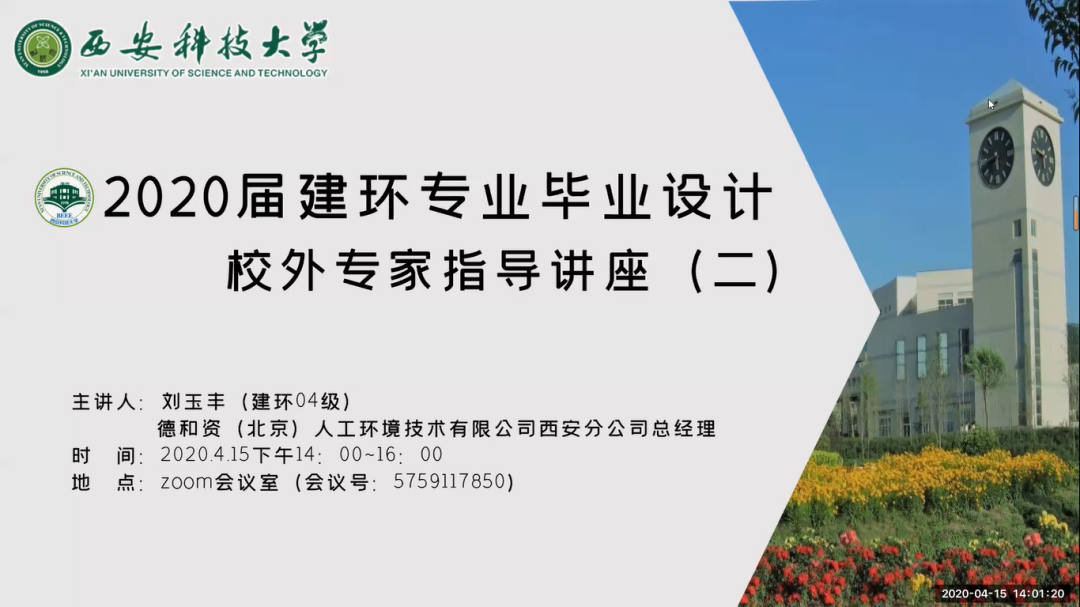 为贯彻落实教育部、教育厅应对疫情防控工作的要求,降低疫情防控对我校2020届本科生毕业设计(论文)工作的影响,提高疫情期间学生的毕业设计质量,2020年4月15日,能源学院建环系邀请校外专家,德和资(北京)人工环境技术有限公司西安分公司总经理刘玉丰,进行了一场有关《冷库设计的基本流程与注意事项》的线上毕设指导讲座。能源学院部分教师及2020届建环专业毕设方向为制冷的本科生通过网络形式参加讲座。