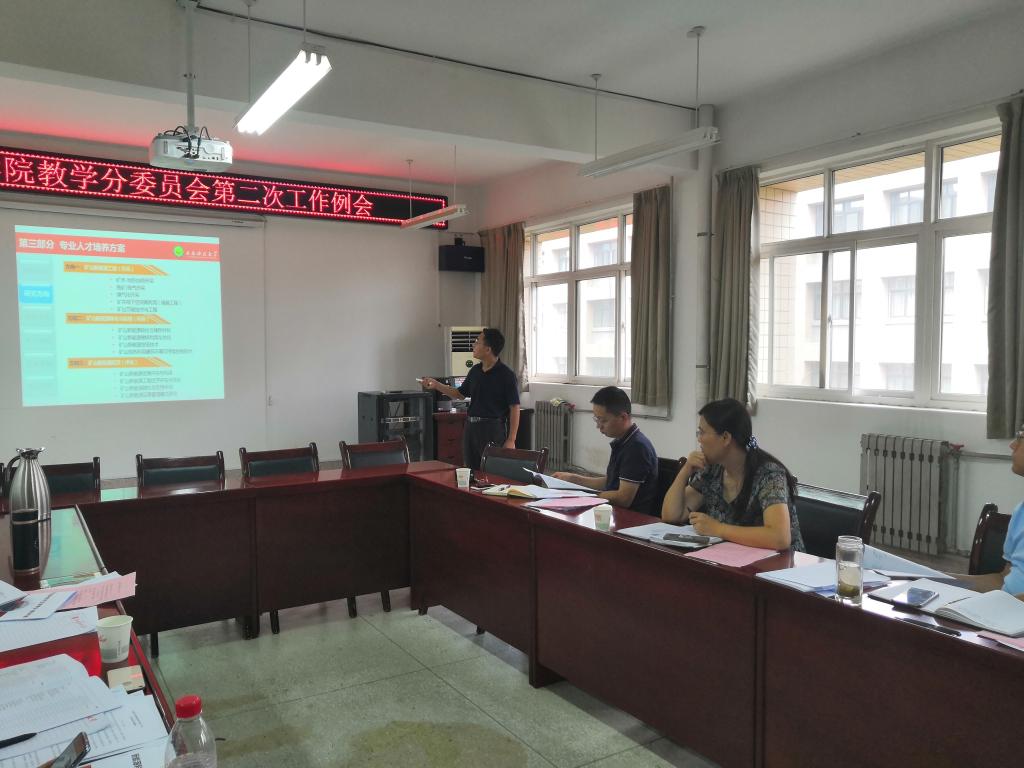 会议的第一阶段由教学秘书张莹汇报了18-19-2学期教学工作完成情况,第二阶段由教学分委员会副主任解盘石汇报了采矿工程智能开采班的培养方案、本科招生情况。第三阶段由刘浪教授介绍了新专业“新能源科学与工程”申报情况及培养方案。第四阶段由赵兵朝教授介绍了西部煤炭绿色开采虚拟仿真实验项目申报情况,第五阶段由解盘石老师介绍了能源学院毕业设计工作管理办法及能源学院关于提升教师课堂教学质量实施办法。
