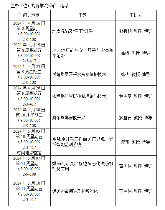 为深入学习贯彻习近平新时代中国特色社会主义思想和党的二十大精神,坚持立德树人理念践,增强能源报国信念,营造良好学术氛围,2024年4月16日-2024年5月10日期间,能源学院邀请10位教授、博士生导师给大家分享采矿工程专业前沿的奥秘。欢迎广大师生积极参加。谢谢!