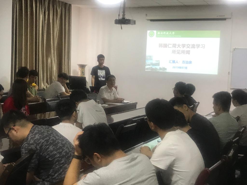 方治余和辛杰从科研与生活两个方面讲述了韩国仁荷大学之行,为同学们展示了国外交流活动受益良多,并接触的学科前沿知识进行讲解,同时也将此次活动经验与体会一一分享给同学们。听了他们细致精彩的经验分享,同学们纷纷表示获益良多,深受鼓舞,将会努力提升自己。这次经验分享会打开了通往外面知识世界的大门,为同学们带来一个新的视角,极大的激发了同学们努力学习,认真科研的决心。