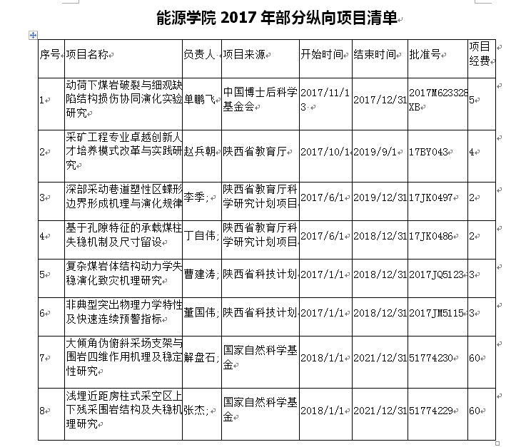 能源学院2017年部分纵向项目清单