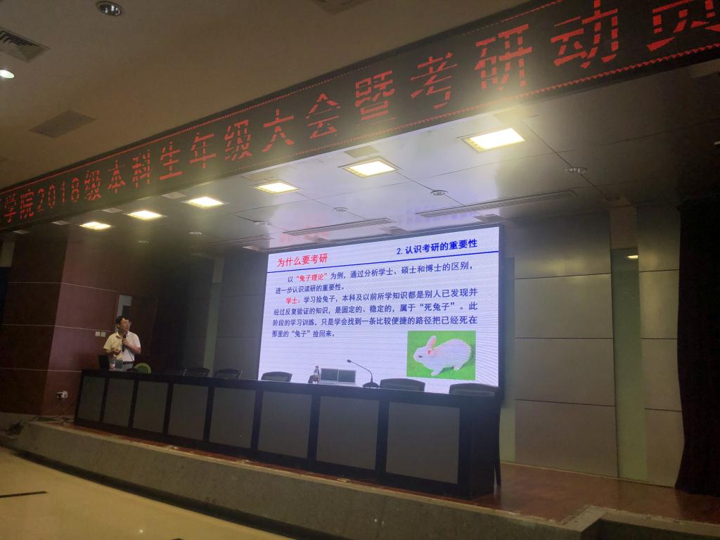 6月11日,能源学院2018级本科生年级大会暨考研动员会在骊山校园图书馆报告厅举行,能源学院院长柴敬、副院长赵兵朝、建筑环境与能源应用工程系主任姜华、采矿工程系副主任孙伟博及2018级全体本科生参加了会议。会议由能源学院学工办主任、团委书记万超主持。
