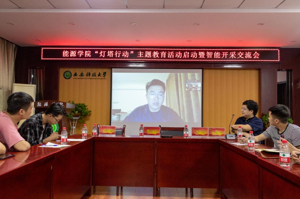 会后举行了“灯塔行动”主题教育的首场交流会。能源学院2016届毕业生、陕西榆北煤业公司李攀,2017届毕业生、陕煤彬长矿业公司李晖,2018届毕业生、榆北煤业公司王俊伟,2019届毕业生、陕西麟北煤业公司吴永松,2020届毕业生、陕西延长石油巴拉素煤业公司王田源等5名毕业生代表就煤炭行业现状、智能开采实践、个人发展以及福利待遇等方面做了线上交流分享。能源学院2019年赴陕北、神东矿区调研暨红色研学实践团成员线下分享了在神东集团大柳塔煤矿、补连塔煤矿,陕煤集团小保当煤矿、柠条塔煤矿,延长石油集团魏墙煤矿等现代化矿井的实践见悟。交流会氛围热烈、反响强烈,切实增强了采矿工程专业学生的专业认同和行业认同。