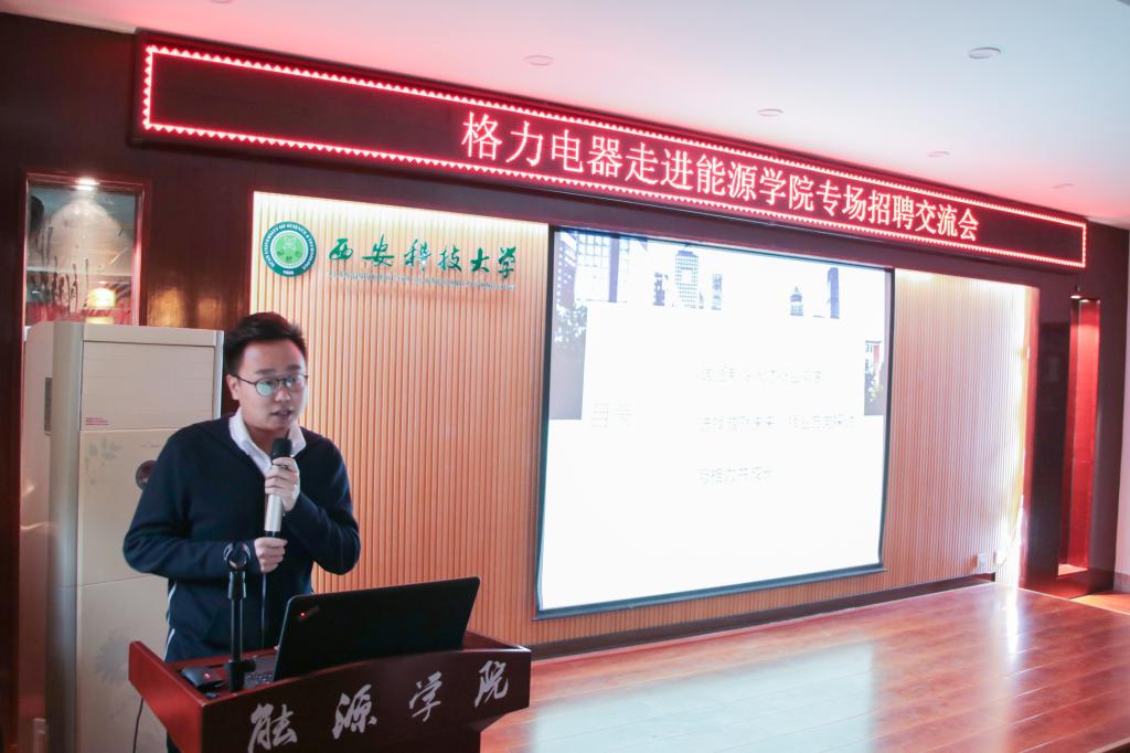 会上,建环系党支部书记张进围绕师资概况、实验平台、校企合作、学生质量等方面对我校建筑环境与能源应用工程专业做了简要介绍;格力电器华中地区副总监李刚对格力电器集团概况、业务范围、发展战略、招聘流程等做了宣讲;与会人员进行了互动交流,现场收取了应聘学生简历。