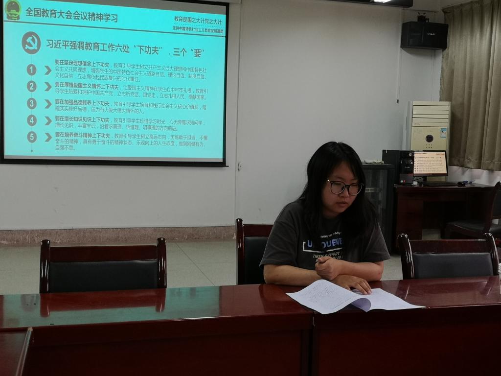 院党委副书记费秀水从全国教育大会召开的时代背景和重要意义、习近平总书记关于教育的重要论述以及“六个下功夫”等方面,并结合学生教育管理实际对全国教育大会主要内容和习近平总书记重要讲话的科学内涵进行了全面解读。院学工办主任、团委书记万超向全体团学干部强调了全国教育大会对青年学生成长成才的重要意义,要求各团支部通过主题团日活动等形式,掀起学习全国教育大会精神的热潮,在学习和实践中坚定理想信念、厚植爱国情怀。辅导员宋晓华、王雪琪、吴蒸和学生重点分享了习近平总书记金句,引导学生树立远大理想、提升自身修为、努力完成学业、争做新时代有为青年。