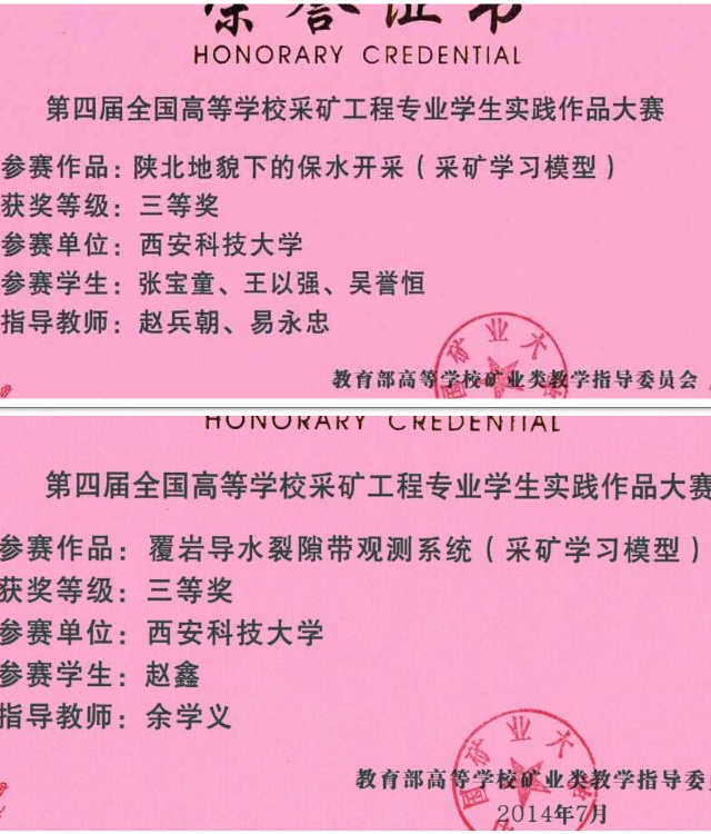 在本届比赛中,由我院选送的代表西安科技大学参赛的作品共获得三等奖两项,分别是由余学义老师指导,我采矿专业学生赵鑫所完成的作品《覆岩导水裂隙带观测系统》和由赵兵朝老师,易永忠老师指导,张宝童,王以强,吴誉恒所完成的作品《陕北地貌下的保水开采》。获奖作品充分体现了我院学生别具一格的创新能力与实践能力。能获得这样的成绩也与学院对这项赛事的重视以及指导老师平日悉心地指导密不可分。