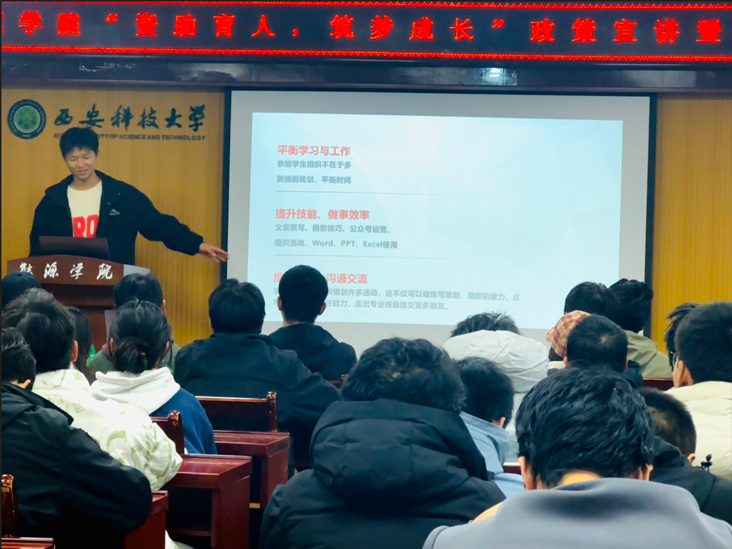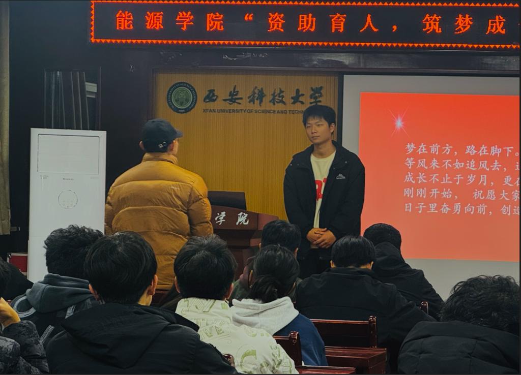 11月27日晚,能源学院2024年学业帮扶公开课第四讲在临潼校区骊山校园14教506举行。国家奖学金获得者、智采2201班郭天乐和各年级受资助学生代表50余人参加了活动。