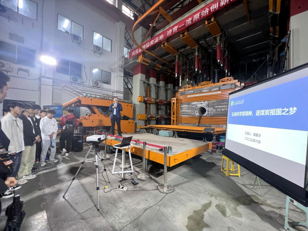 揭牌仪式后,重点实验室副主任高喜才从新中国第一位采煤女专家吴绍倩教授的事迹展开讲解,引导同学们学习老一辈科学家“胸怀祖国、服务人民的爱国精神”“迎难而上、敢为人先的创新精神”“严谨治学、追求真理的求实精神”“淡泊名利、奖掖后学的奉献精神”。随后,能源学院副院长解盘石介绍了难采煤层智能开采数字孪生实验平台,以及研究团队“迎难而上,求真力行”的科学精神。