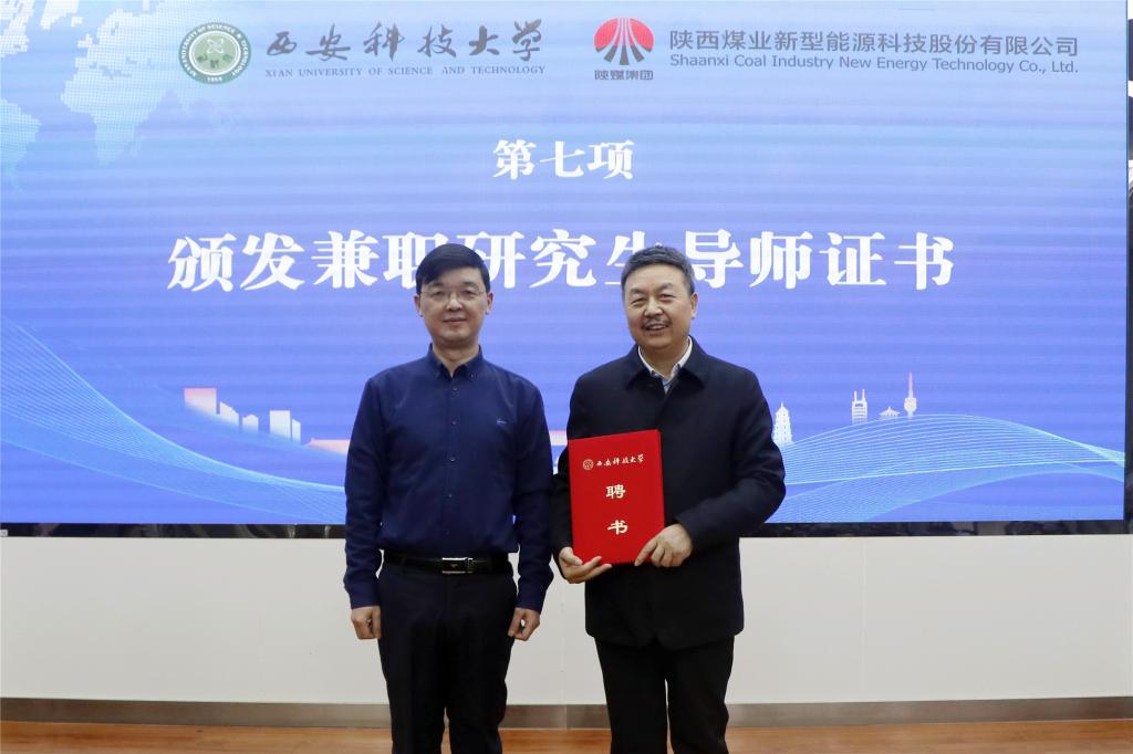 仪式上,邓军副校长和高小军书记代表双方签订了合作协议,公司和学校分别授牌新能源联合科研创新基地和能源学院实践基地,学校向方刚董事长颁发了兼职研究生导师证书。