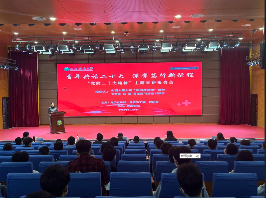 11月5日,中国人民大学“延河讲师团”走进西安科技大学开展“青年共话二十大∙深学笃行新征程”党的二十大精神主题宣讲报告会,报告会由党委宣传部、学工部、校团委主办,能源学院承办,以“主会场+分会场”联动、“线上+线下”并行的方式举行。中国人民大学团委书记丁莉婷,“延河讲师团”讲师党方圆、吴鑫、曾艳雯、马浩涵、刘顺天;西安科技大学党委副书记陈春林,宣传部、学工部、校团委、能源学院党委负责人,各学院辅导员代表,学工系统理论宣讲团、校团委“胡杨花”青年学生宣讲团、马克思主义学院“红言”宣讲团全体成员以及能源学院全体学生参加了报告会。报告会由能源学院党委负责人主持。
