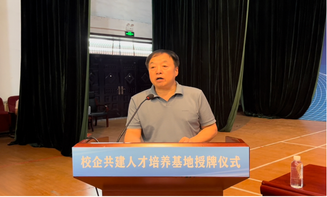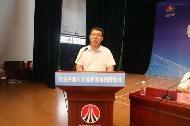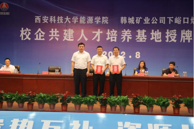 刘新民首先代表矿业公司,对西安科技大学能源学院领导到韩城矿业公司矿区进行《校企共建人才培养基地》签约表示欢迎,向校企共建人才培养基地授牌表示祝贺。指出西安科技大学与韩城矿业公司在多年的发展历程里建立了深厚的友情,双方在科研项目和人才培养方面合作紧密、成效显著,为公司输送培养了大量的专业技术人才和科技创新理念。对该矿遇到安全生产难题时,学院积极配合开展煤巷快速掘进、通风系统优化、技术鉴定等项目,取得了良好的成效表示感谢。并结合西安科技大学学科特色、专业结构、师资力量、及国内行业领域影响,根据韩城矿业地质条件和自然灾害特点,强调只有通过持续推进的科技创新、管理创新,才能提高灾害治理能力,保障矿井安全生产,推动公司高质量发展,而这一切的根本在于人才。希望通过此次相互合作,立足新起点,以智能化建设人才需求为导向,培养出更多的高素质技术人才,补齐公司在安全生产、智能化建设、人才不足等发展短板,加快实现公司智能化建设发展目标,绘制韩城矿业高质量发展新蓝图。