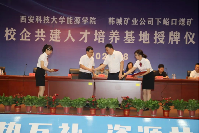 8月2日,我院与韩城矿业公司下峪口煤矿举行校企共建人才培养基地签约授牌仪式,为实现“校企合作、产学共赢”迈出了重要的一步。我院党委书记陈吉兰、院长赵兵朝、副院长丁自伟、团委书记万超、采矿系副主任杨涛、韩城矿业公司党委委员、副总经理刘新民,人力资源部部长贾谦、下峪口矿党委书记李成、矿长张杰等相关负责人出席授牌仪式。