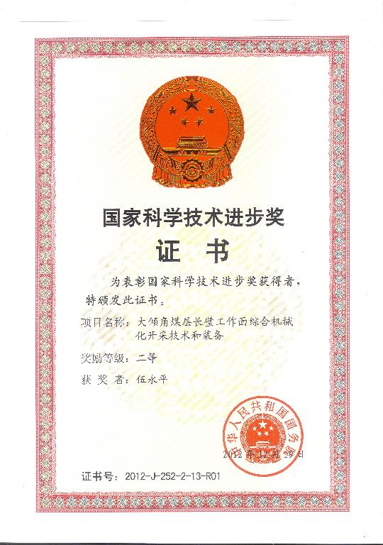 2013年 1月18日上午,中共中央、国务院在北京人民大会堂隆重举行国家科学技术奖励大会。西安科技大学能源学院院长伍永平教授主持完成的《大倾角煤层长壁工作面综合机械化开采技术和装备》项目荣获国家科学技术进步二等奖。
