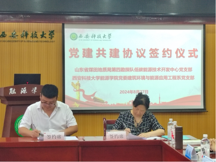8月27日,西安科技大学能源学院与山东省煤田地质局第四勘探队签署战略合作及党建结对共建合作协议。西安科技大学能源学院党委书记陈吉兰、副院长解盘石、建环系党支部书记陈柳及教师代表,山东省煤田地质局第四勘探队党委副书记兼队长李海波、副队长吴建华、低碳能源技术开发中心党支部书记兼主任王维想、低碳能源技术开发中心副主任张晓锋出席签约仪式并座谈交流。