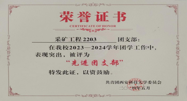 截至目前:采矿工程2203团支部获评“先进团支部”,4人获评优秀共青团员,3人获评优秀共青团干部,2人获评优秀学生干部,3人获评三好学生,1人获评三好优秀生,3人获得国家励志奖学金,9人获得优秀本科生奖学金。