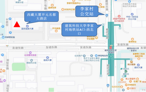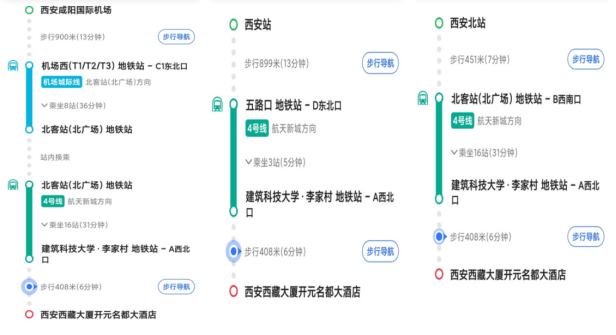 西安站→西藏大厦开元名都大酒店:在火车站公交站乘坐5路/500路/41路/30路/25路至李家村公交站下车,步行400米到达目的地。价格约2元。西安北站→西藏大厦开元名都大酒店:高铁出站后乘坐地铁四号线(航天新城方向)至建筑科技大学李家村站A口下车,步行500米到达目的地。价格约5元。