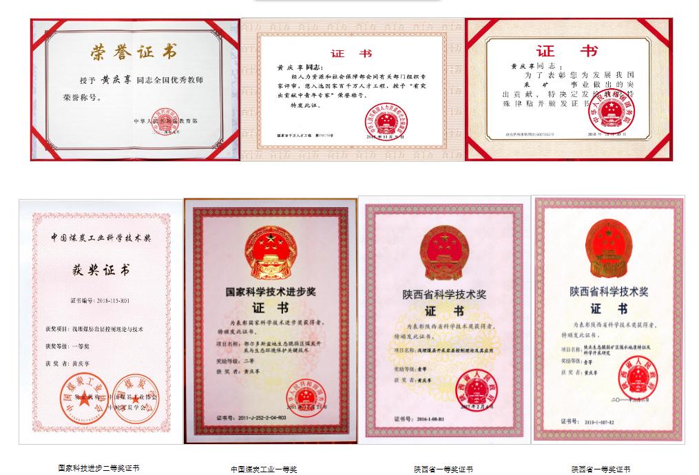 获得国家科技进步二等奖1项,省部级科学技术一等奖7项,二、三等奖9项,获得陕西省自然科学优秀论文一等奖1项,陕西省职工发明金奖1项,入选《煤炭学报》创刊60周年最具影响力百篇学术论文1篇,被日本JST全文翻译转载1篇。